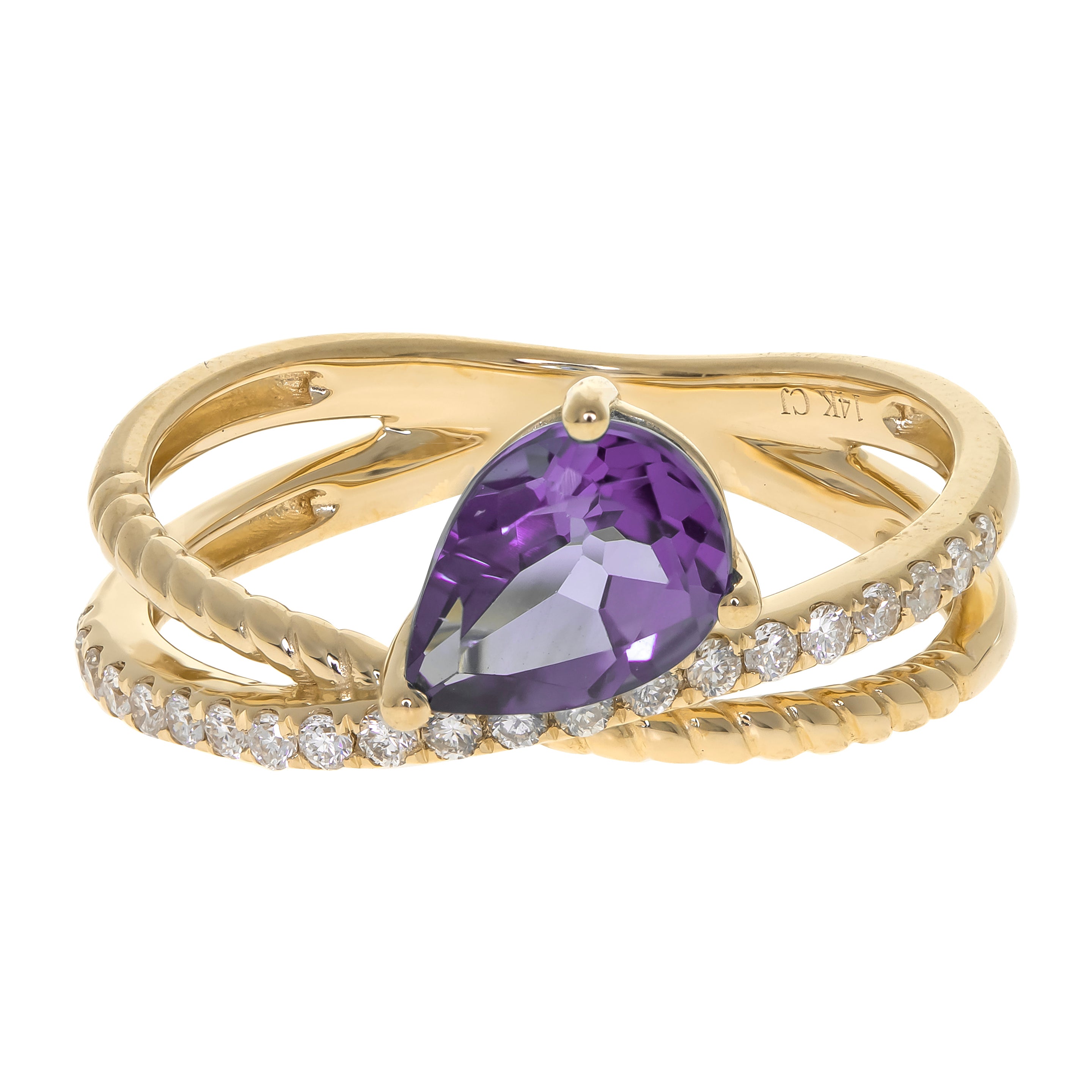 Stunning, timeless and classy eternity Unique Ring. Decorate yourself in luxury with this Gin & Grace Ring. The 10K Yellow Gold jewelry boasts Pear-Cut Prong Setting Natural Amethyst (1 pc) 1.01 Carat, along with Natural Round cut white Diamond (21 Pcs) 0.18 Carat, accent stones for a lovely design. This Ring is weight 2.58 grams. Crafted with 10K Yellow Gold, this delicate Ring is polished to a high finish shine.