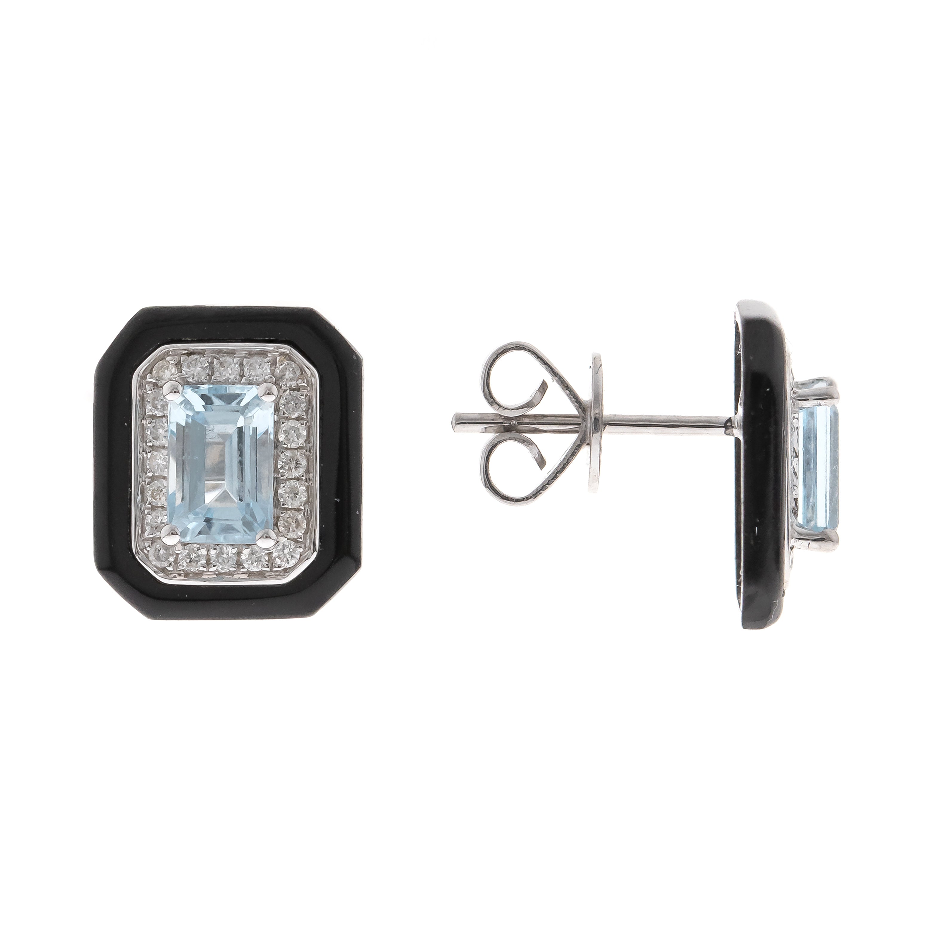 Decorate yourself in elegance with this Earring is crafted from 14-karat White Gold by Gin & Grace Earring. This Earring is made up of Aquamarine Emerald-cut (2 Pcs) 1.10 Carat, onyx free (2 pcs)1.56 carat and Round-Cut Prong setting White Diamond (40 Pcs) 0.20 Carat. This Earring is weight 2.23 grams. This delicate Earring is polished to a high finish shine.