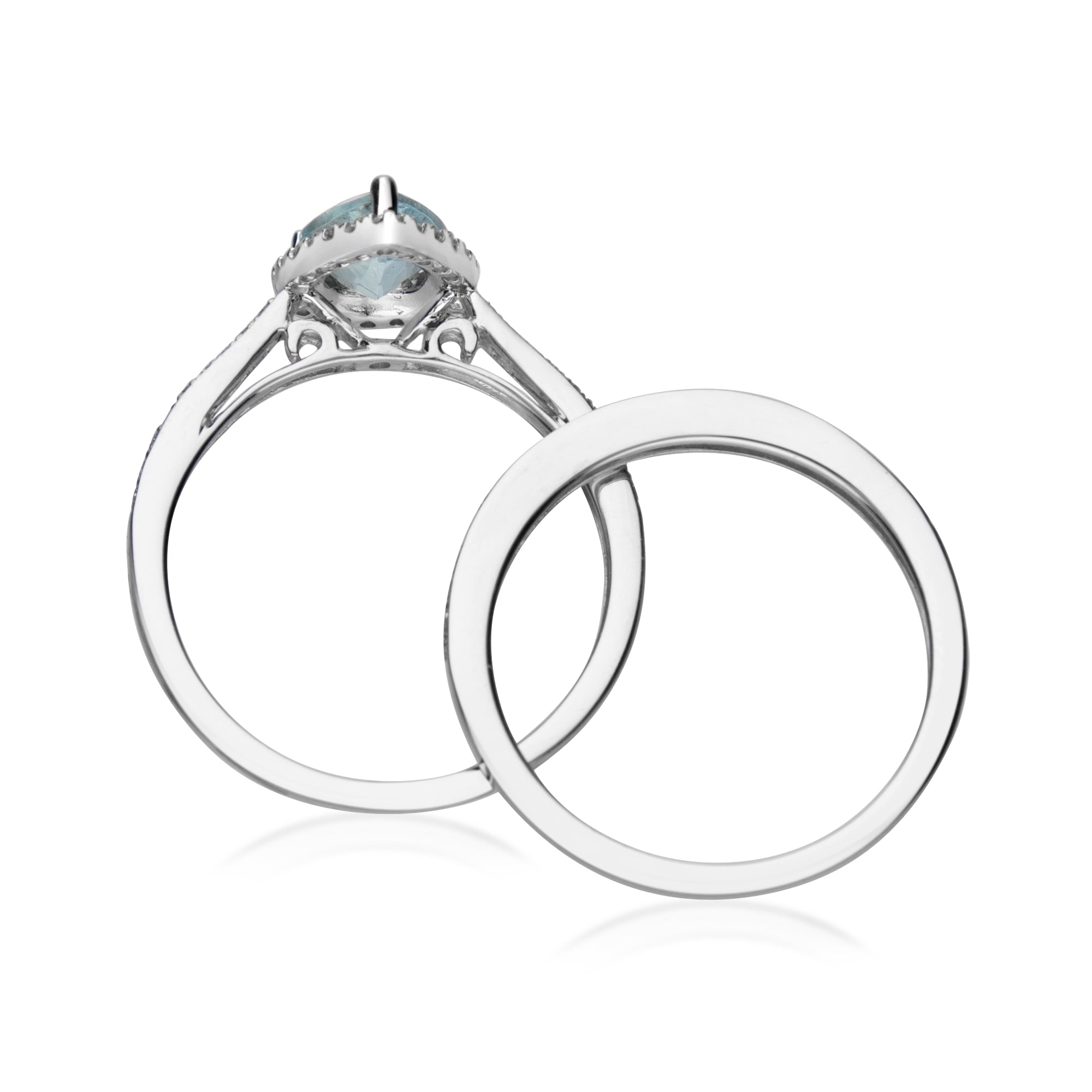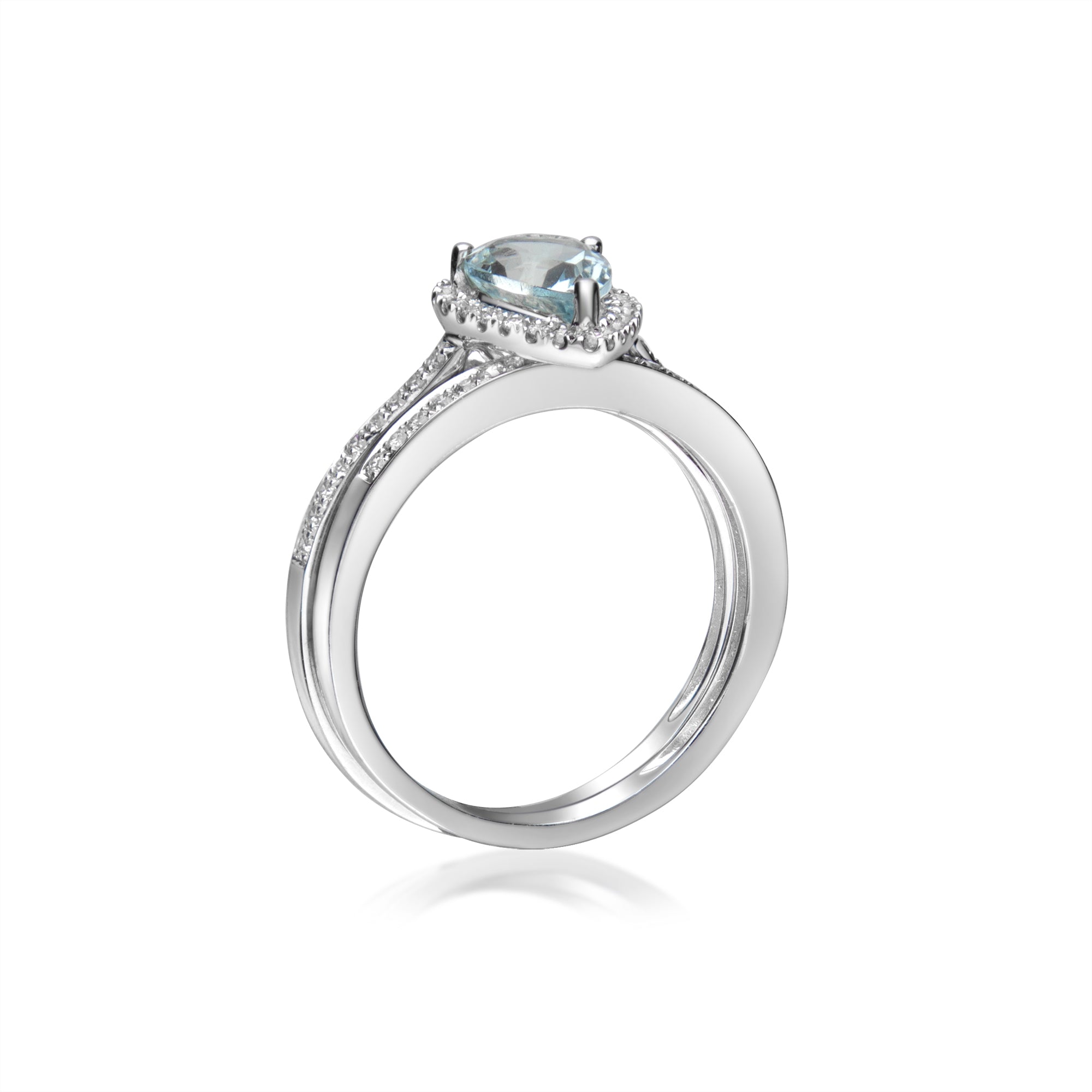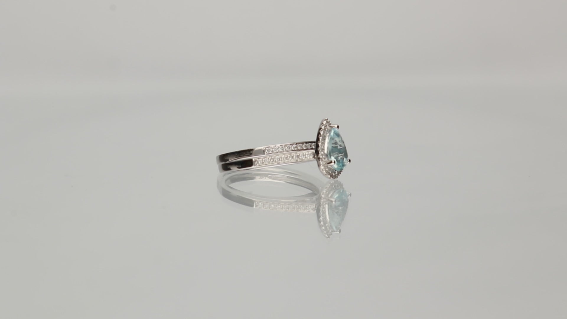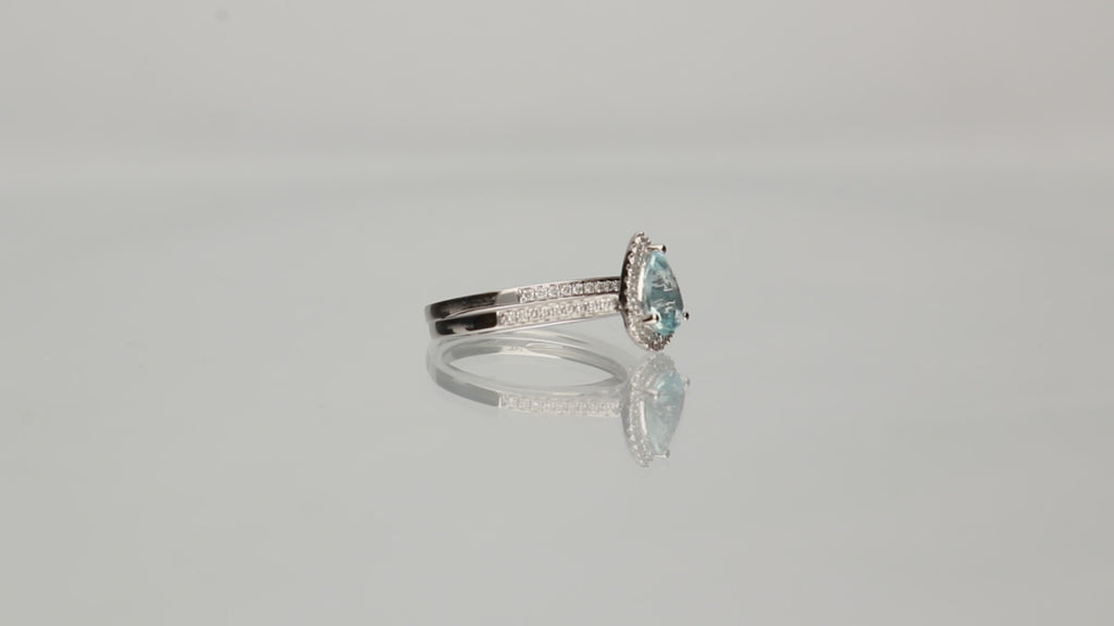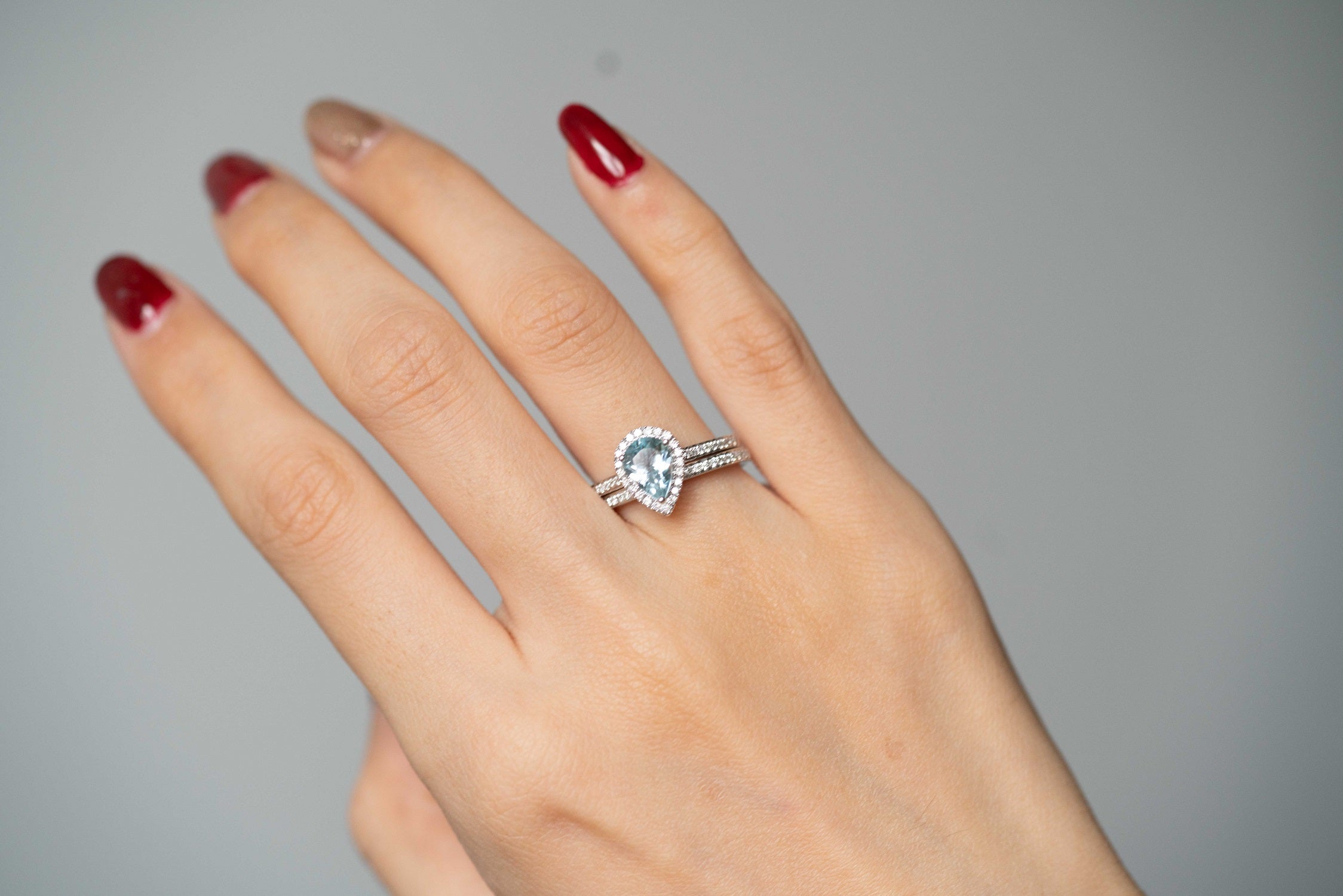 Stunning, timeless and classy eternity Engagement ring. Decorate yourself in luxury with this Gin & Grace ring. This ring is made up of 6X8 Pear-Cut Prong Setting Genuine Brazilian Aquamarine (1 pcs) 1.08 Carat and Round-Cut Prong Setting Diamond (63 pcs) 0.32 Carat accent stones for a lovely design. This ring is weight 4.12 grams. The ring is crafted of shining 14-karat White Gold and is completed by a highly polished finish8