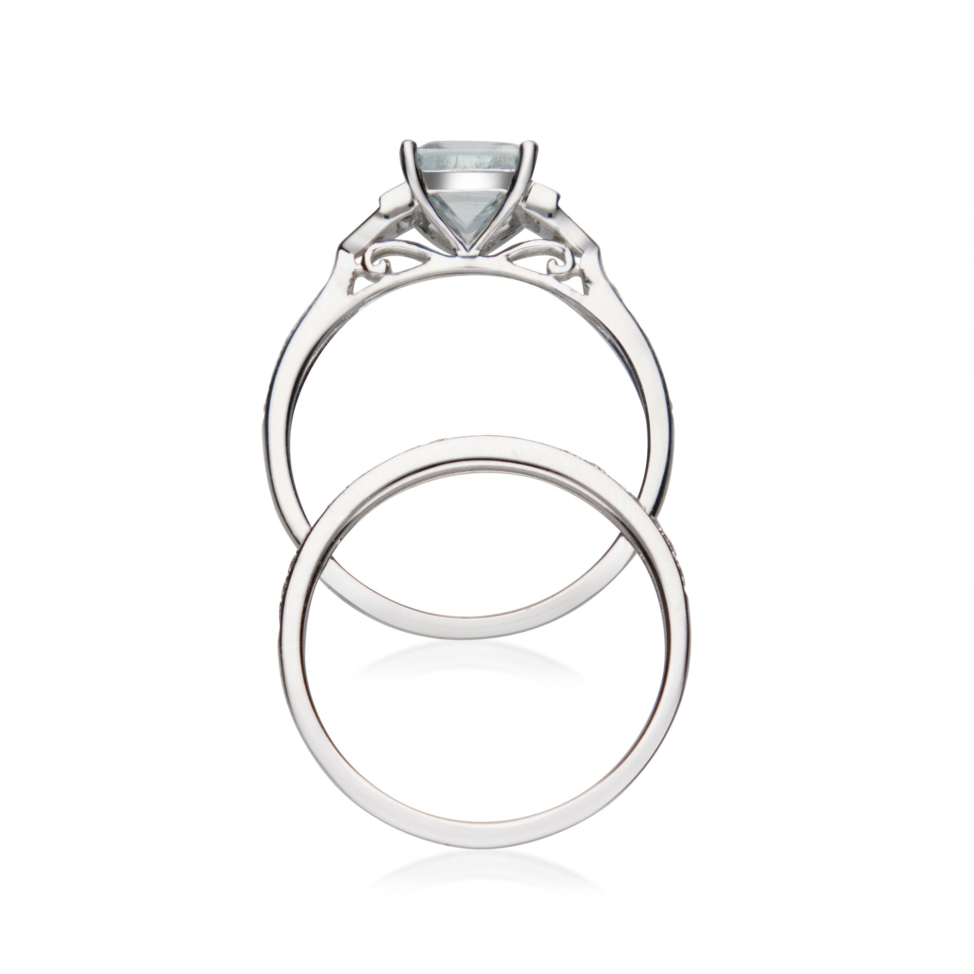 Stunning, timeless and classy eternity Engagement ring. Decorate yourself in luxury with this Gin & Grace ring. This ring is made up of 6X8 Emerald-Cut Prong Setting Genuine Brazilian Aquamarine (3 pcs) 1.32 Carat and Round-Cut Prong Setting Diamond (34 pcs) 0.26 Carat accent stones for a lovely design. This ring is weight 3.30 grams. The ring is crafted of shining 14-karat White Gold and is completed by a highly polished finish.