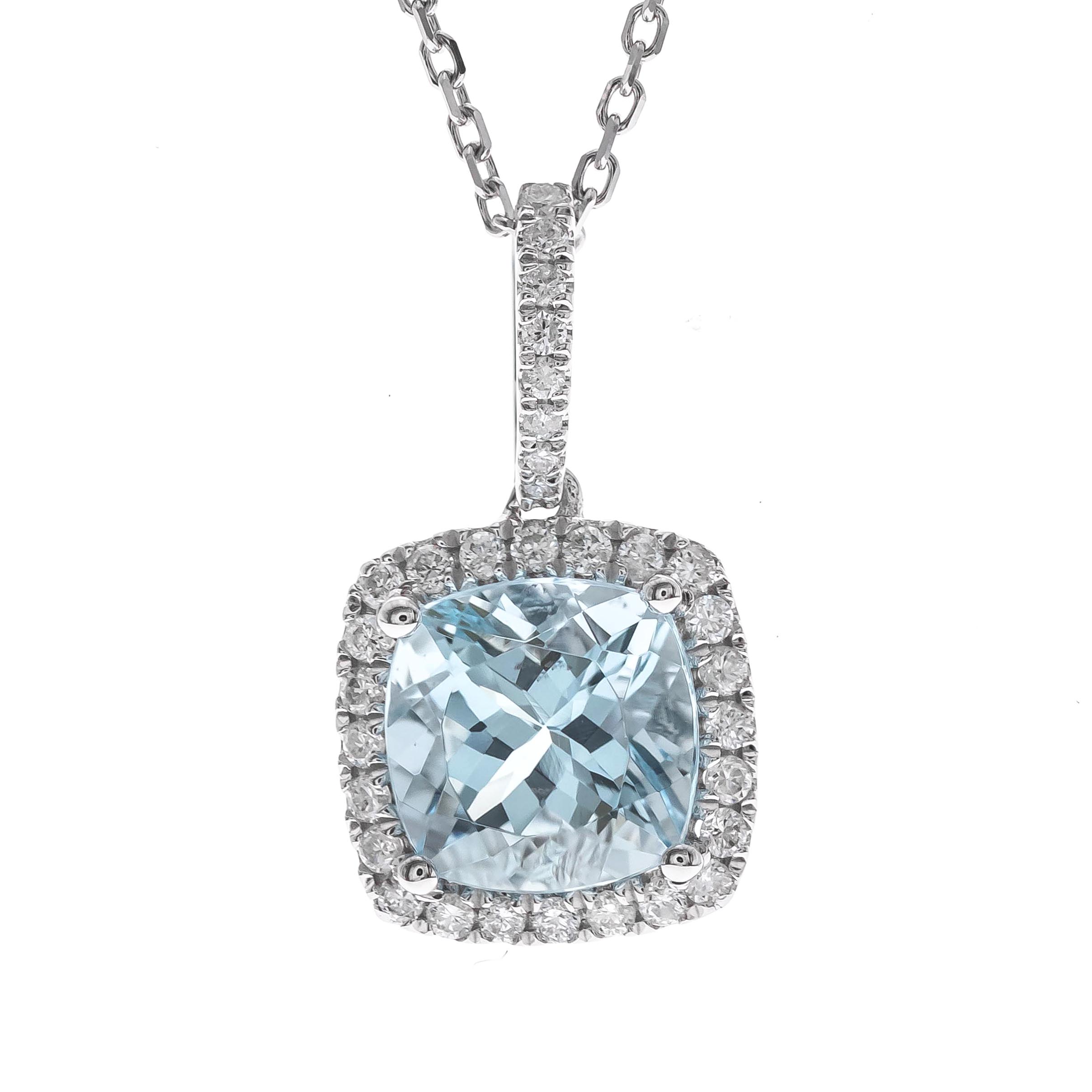 Decorate yourself in elegance with this Pendant is crafted from 14-karat White Gold by Gin & Grace. This Pendant is made up of 7.0mm Cushion-Cut Aquamarine (1 pcs) 1.49 carat and round-cut White Diamond (34 Pcs) 0.24 Carat. The Pendant is weight 2.67 grams. This delicate Pendant is polished to a high finish shine.
