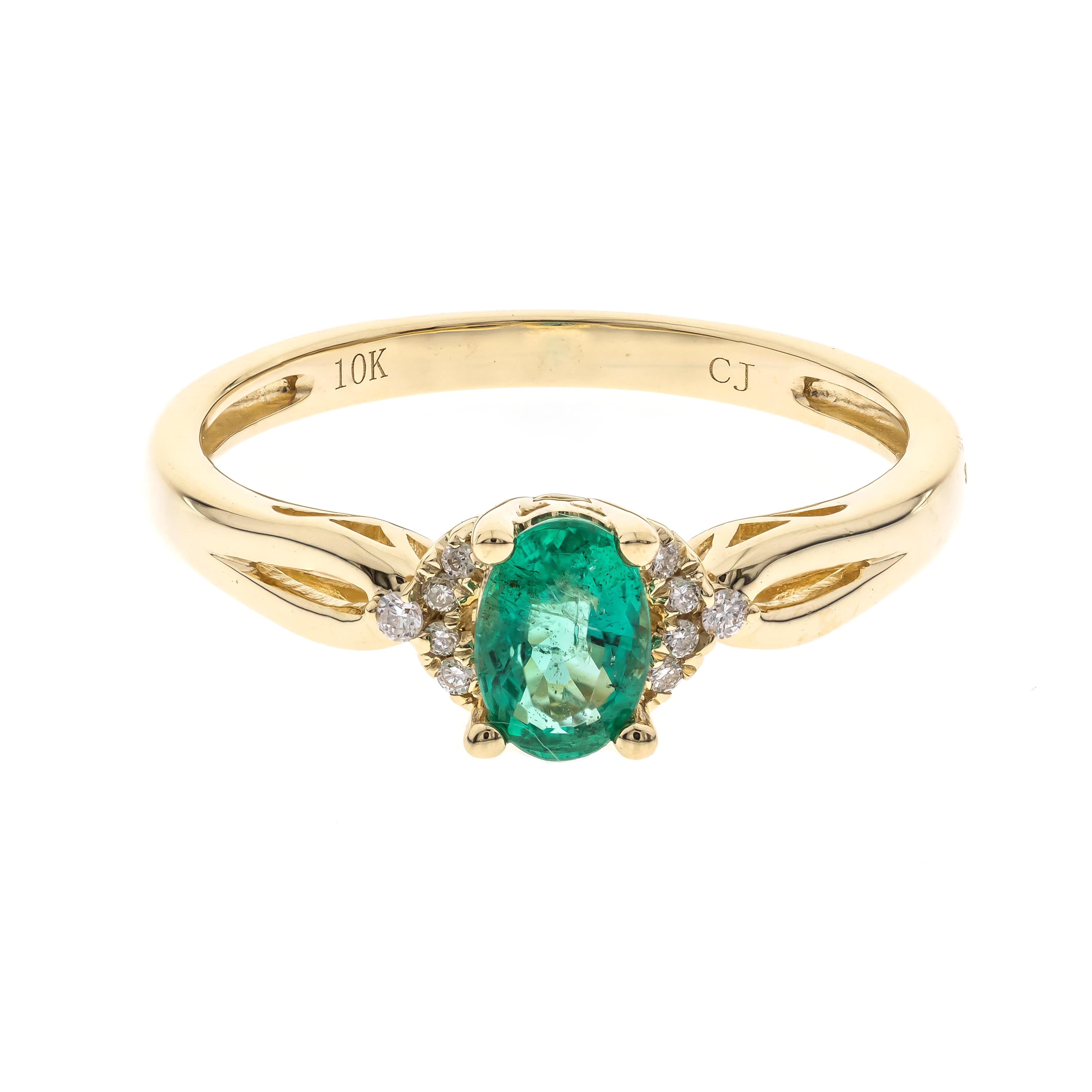 Stunning, timeless and classy eternity Unique ring. Decorate yourself in luxury with this Gin & Grace ring. The 10k Yellow Gold jewelry boasts 4X6 Oval-Cut Prong Setting Natural Zambian Emerald (1pcs) 0.45 Carat and Round-Cut Prong Setting Natural Diamond (10pcs) 0.05 Carat accent stones for a lovely design. This ring is weight 2.0 grams. Crafted with 10k Yellow Gold, this delicate Ring is polished to a high finish shine.