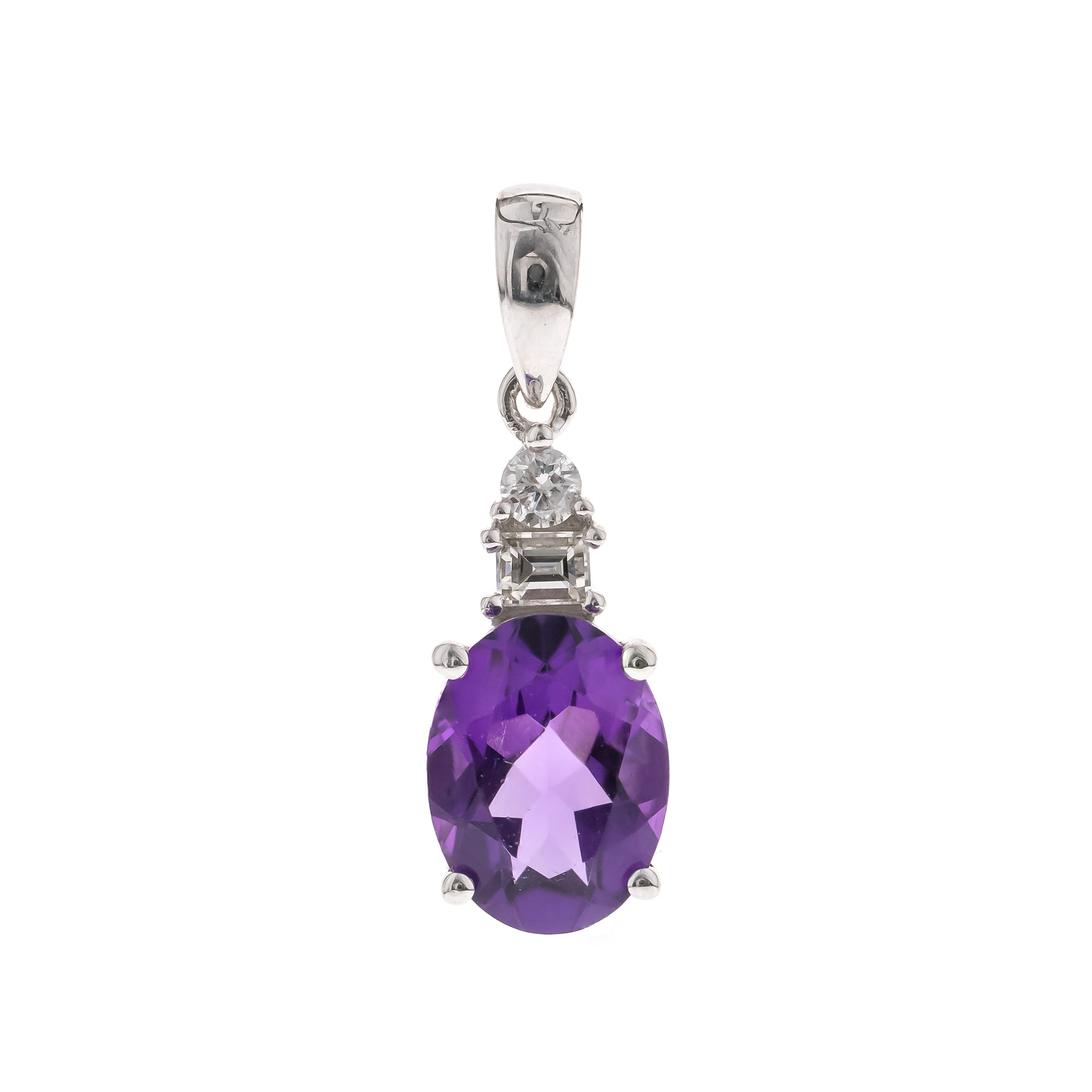 Decorate yourself in elegance with this Pendant is crafted from 10-karat White Gold by Gin & Grace Pendant. This Pendant is made up of Oval-Cut Prong setting Brazilian Amethyst (1 Pcs) 1.16 Carat and Baguette-Cut Prong setting White Diamond (1 Pcs) 0.04 Carat, Round-Cut Prong setting White Diamond (1 Pcs) 0.03 Carat. This Pendant is weight 0.74 grams. The gorgeous Pendant hangs from an 18-inch wheat chain. This delicate Pendant is polished to a high finish shine.