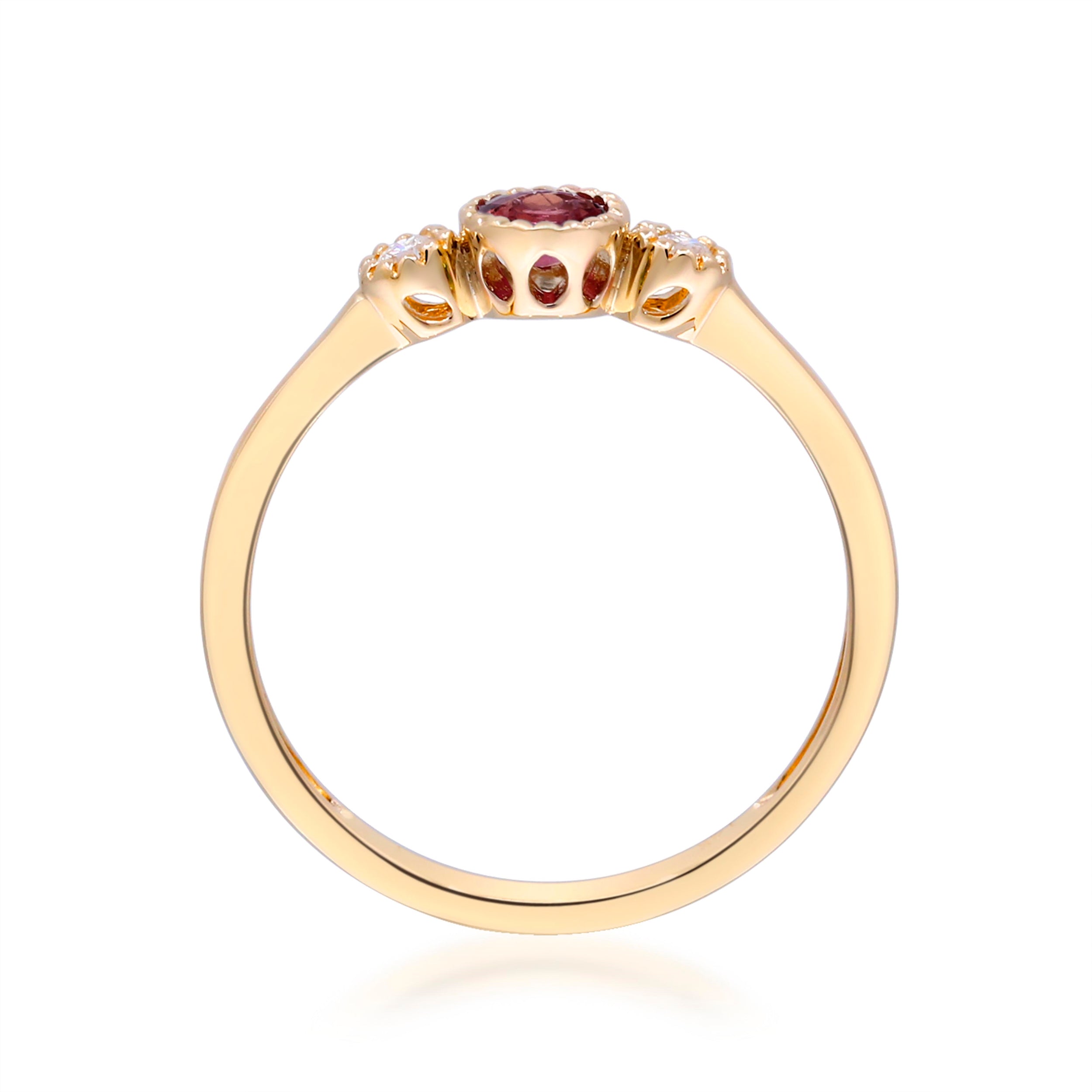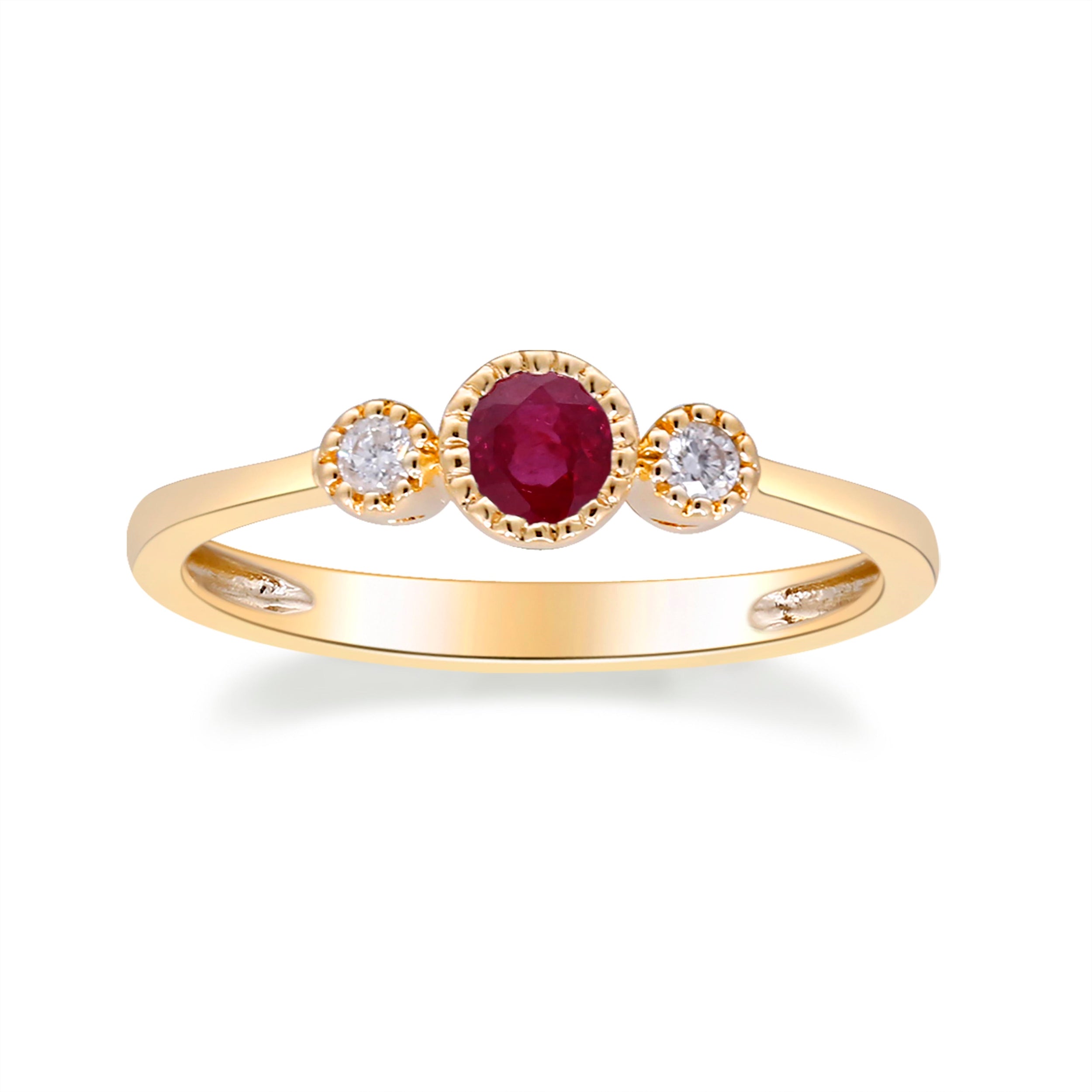 Decorate yourself in elegance with this Ring is crafted from 10-karat Yellow Gold by Gin & Grace Ring. This Ring is made up of 4.0 mm Round-Cut Mozambique Ruby (1 pcs) 0.33 carat and Round-cut White Diamond (2 Pcs) 0.07 Carat. This Ring is weight 1.37 grams. This delicate Ring is polished to a high finish shine. Â