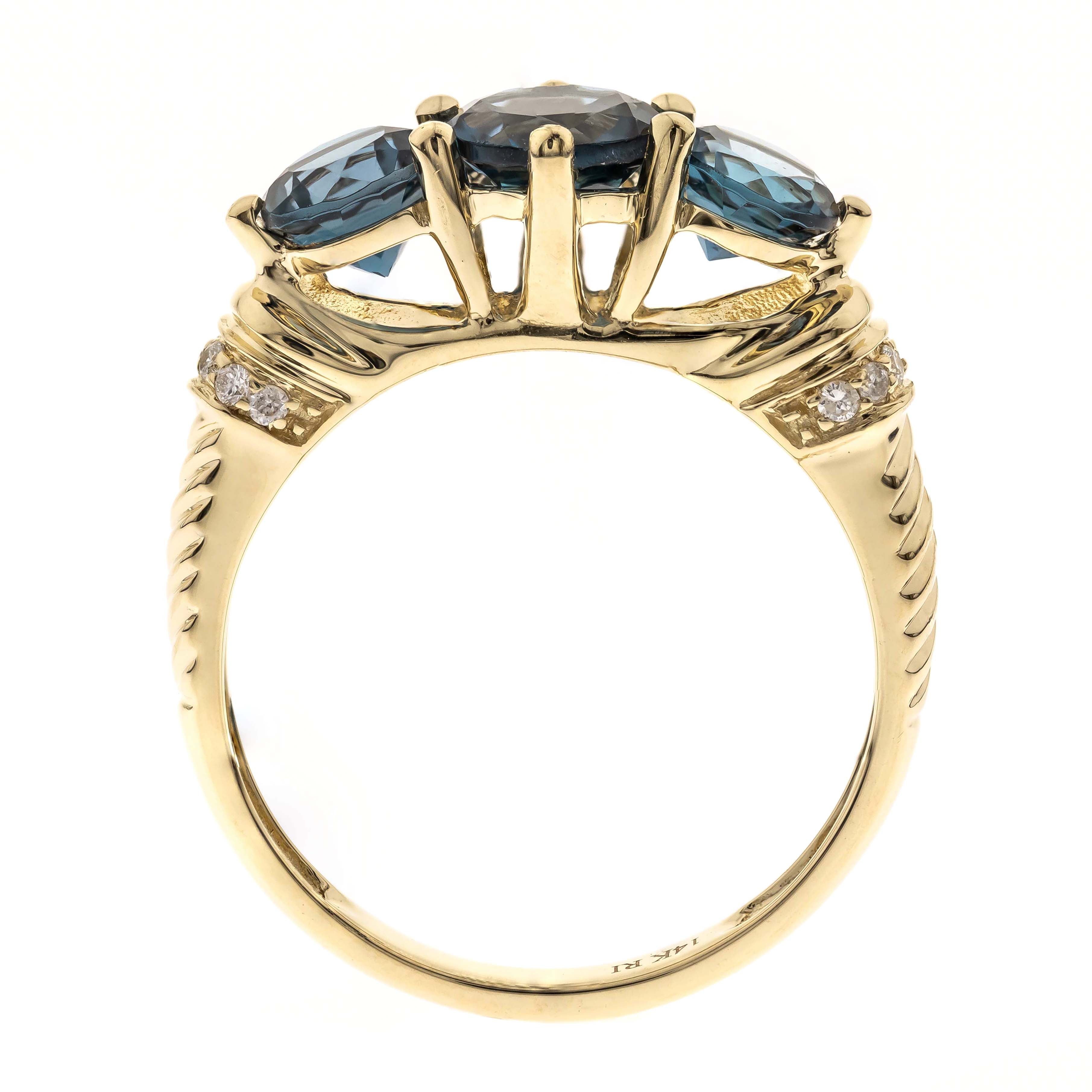 Decorate yourself in elegance with this Ring is crafted from 14-karat Yellow Gold by Gin & Grace. This Ring is made up of 5 mm Round-cut (2 pcs) 1.11 carat Topaz and 6 mm Round-cut (1 pcs) 0.95 carat Brazilian London Blue Topaz and Round Cut Diamond (12 Pcs) 0.08 Carat. This Ring is weight 2.79 grams. This delicate Ring is polished to a high finish shine.