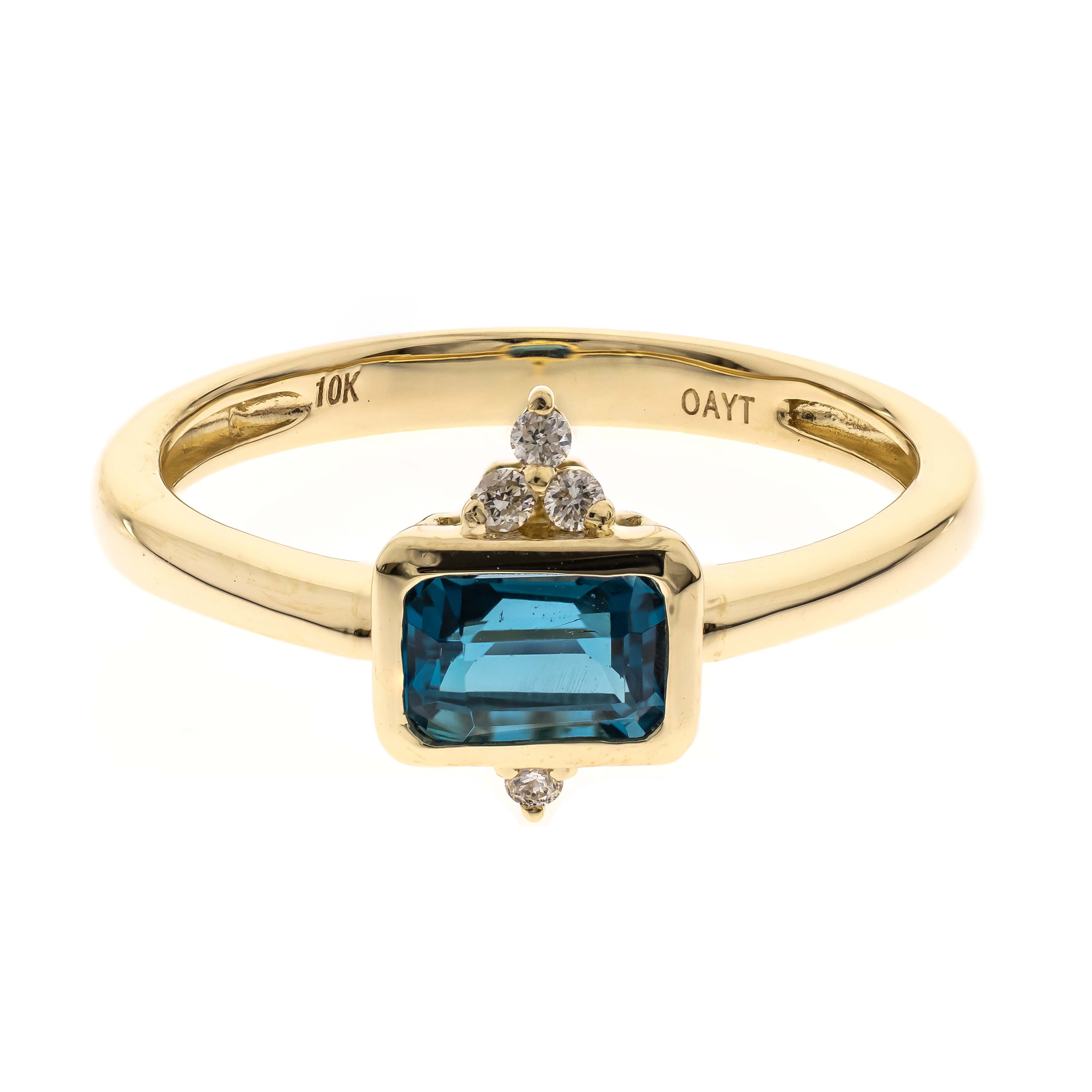 Stunning, timeless and classy eternity Unique Ring. Decorate yourself in luxury with this Gin & Grace Ring. The 14k Yellow Gold jewelry boasts Emerald-Cut Basel Setting Genuine Brazilian London Blue Topaz (1 pc) 0.99 Carat, along with Natural Round Cut white Diamond (4 Pcs) 0.04 Carat, accent stones for a lovely design. This Ring is weight 2.15 grams. Crafted with 14k Yellow Gold, this delicate Ring is polished to a high finish shine.