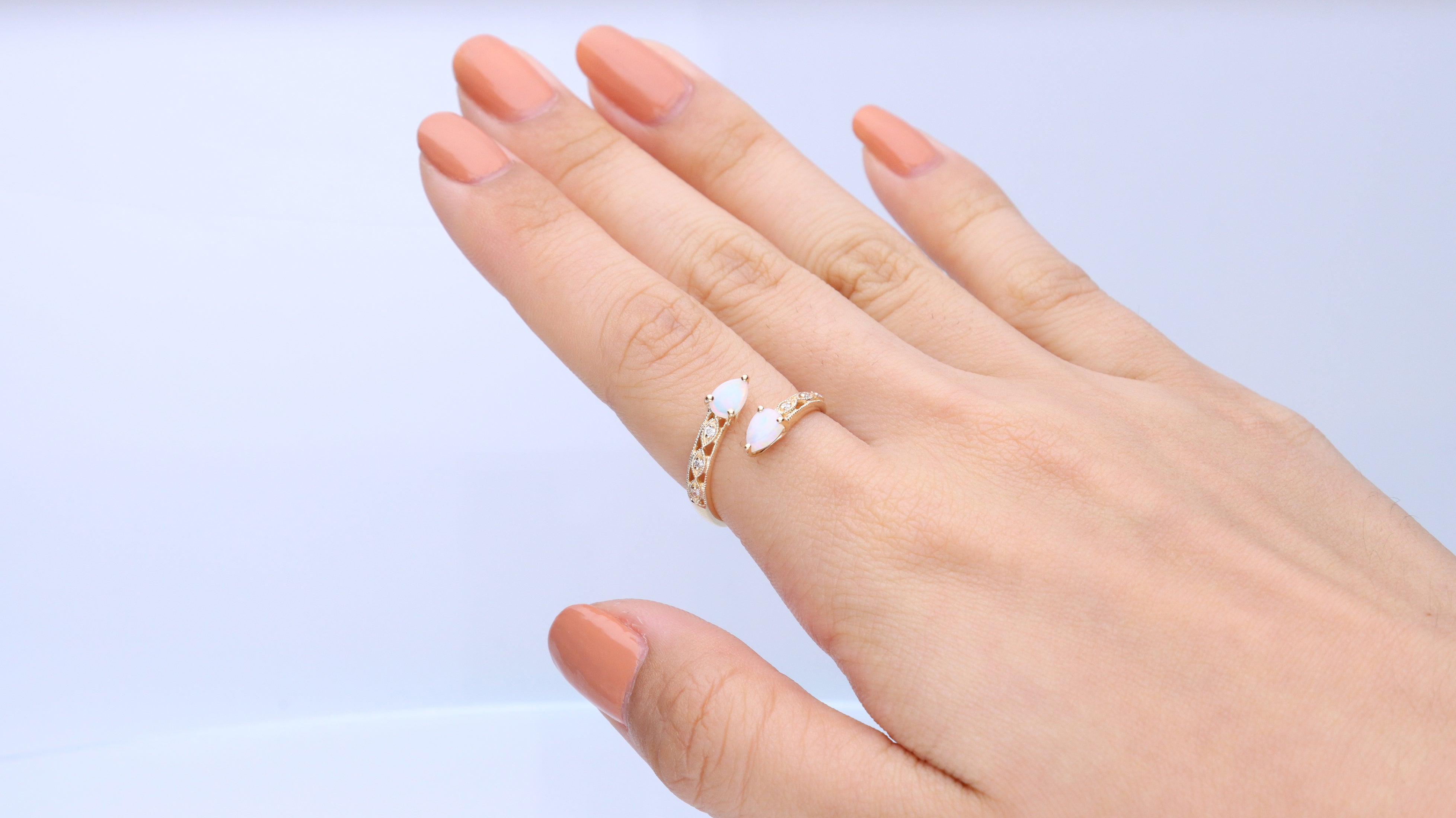 Stunning, timeless and classy eternity Unique Ring. Decorate yourself in luxury with this Gin & Grace Ring. The 14K Yellow Gold jewelry boasts Pear-Cut Prong Setting Natural African Opal (2 pcs) 0.50 Carat, along with Natural Round Cut white Diamond (6 Pcs) 0.06 Carat, accent stones for a lovely design. This Ring is weight 2.35 grams. Crafted with 14K Yellow Gold, this delicate Ring is polished to a high finish shine.