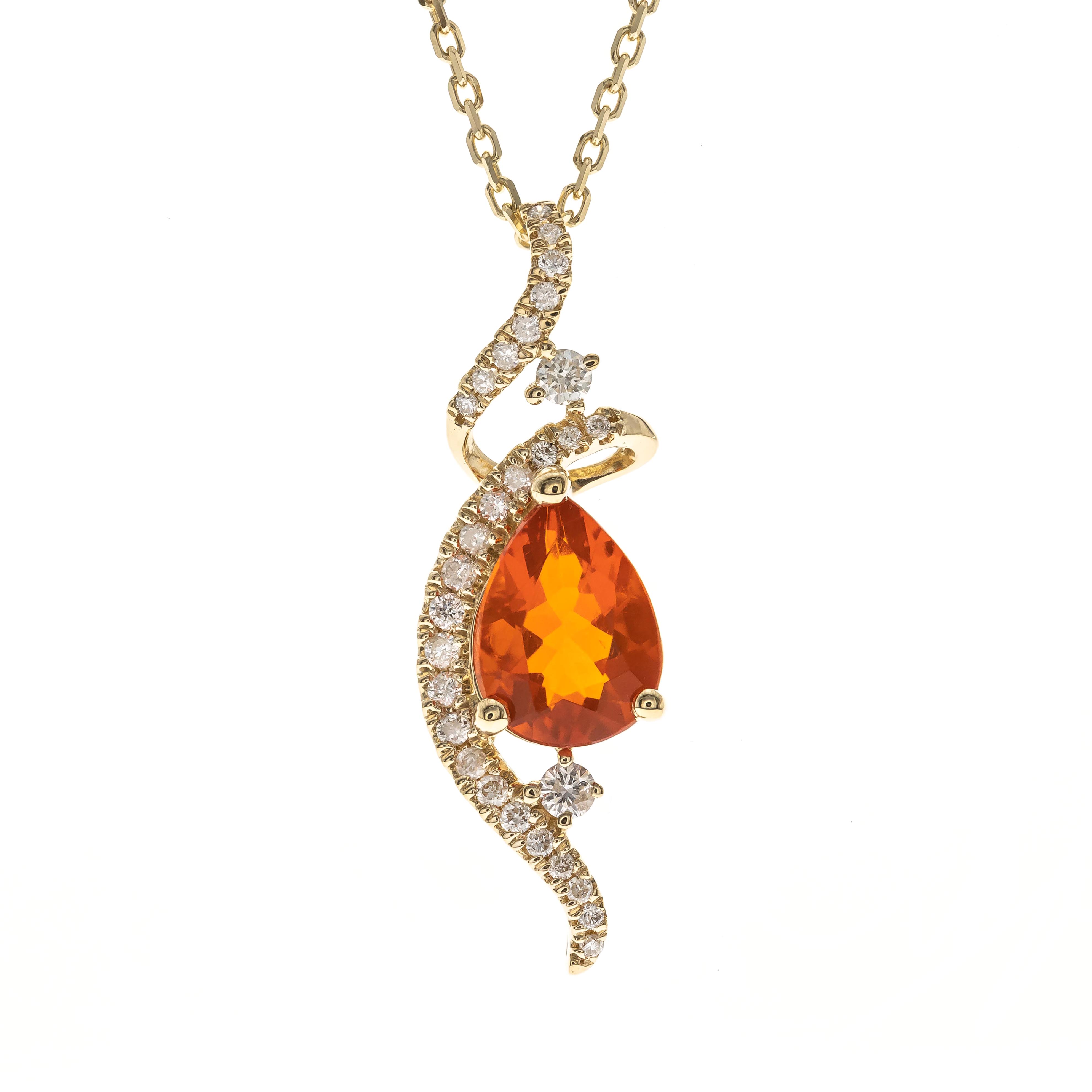 Decorate yourself in elegance with this Pendant is crafted from 14-karat Yellow Gold by Gin & Grace Pendant. This Pendant is made up of 6*8 mm Pear-Cut Prong setting Natural Mexican Fire Opal (1 Pcs) 0.06 Carat and Round-Cut Prong setting Natural White Diamond (27 Pcs) 0.12 Carat. This Pendant is weight 1.12 grams. The gorgeous Pendant hangs from a 18-inch wheat chain. This delicate Pendant is polished to a high finish shine.