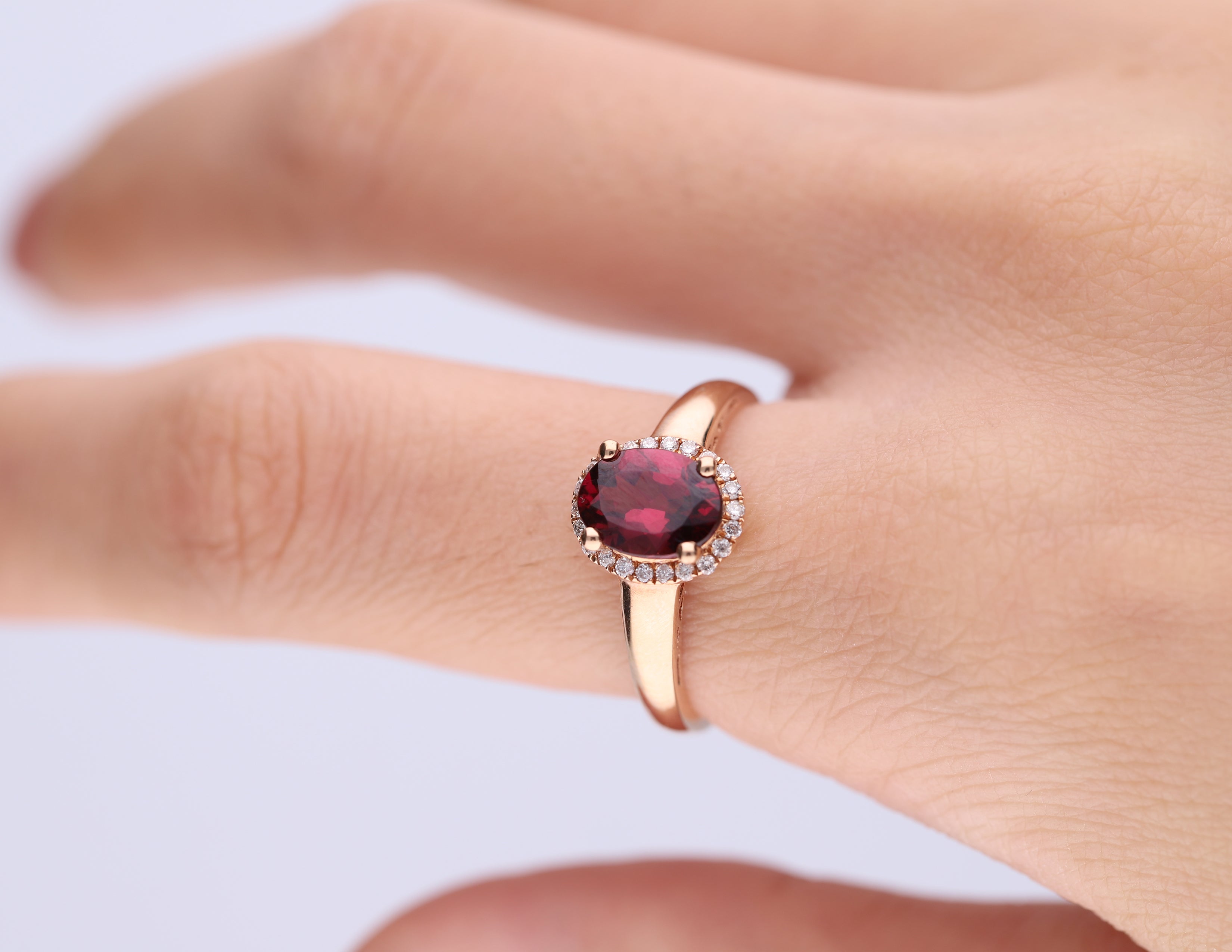 Stunning, timeless and classy eternity Unique Ring. Decorate yourself in luxury with this Gin & Grace Ring. The 10K Rose Gold jewelry boasts Oval-Cut Prong Setting Raspberry color Natural Madagascar Rhodolite Garnet (1 pcs) 1.47 Carat, along with Natural Round cut white Diamond (22 Pcs) 0.12 Carat, accent stones for a lovely design. This Ring is weight 2.28 grams. Crafted with 10K Rose Gold, this delicate Ring is polished to a high finish shine.