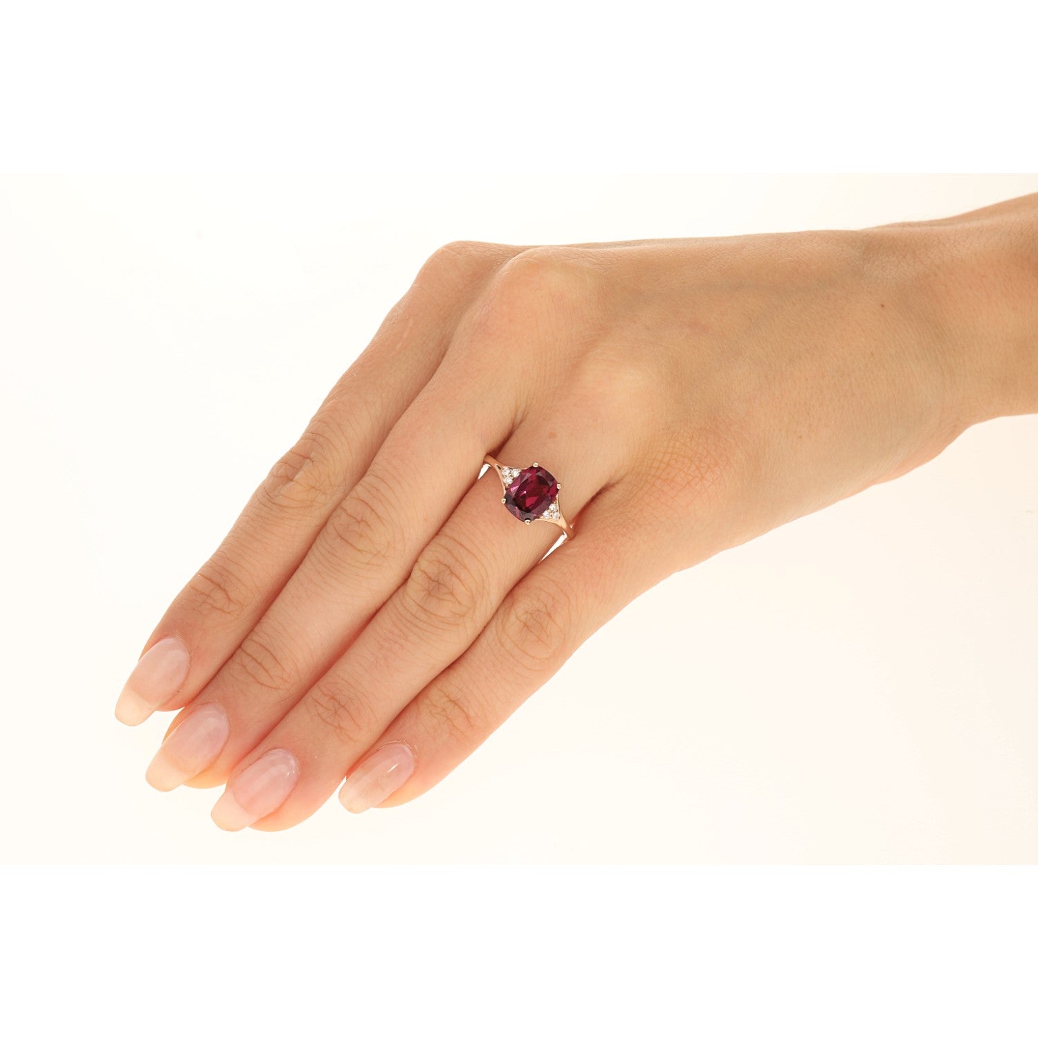 Stunning, timeless and classy eternity Unique Ring. Decorate yourself in luxury with this Gin & Grace Ring. The 10K Rose Gold jewelry boasts Cushion-Cut Prong Setting Raspberry color Natural Madagascar Rhodolite Garnet (1 pcs) 2.50 Carat, along with Natural Round cut white Diamond (6 Pcs) 0.08 Carat , accent stones for a lovely design. This Ring is weight 1.93 grams. Crafted with 10K Rose Gold, this delicate Ring is polished to a high finish shine.7