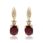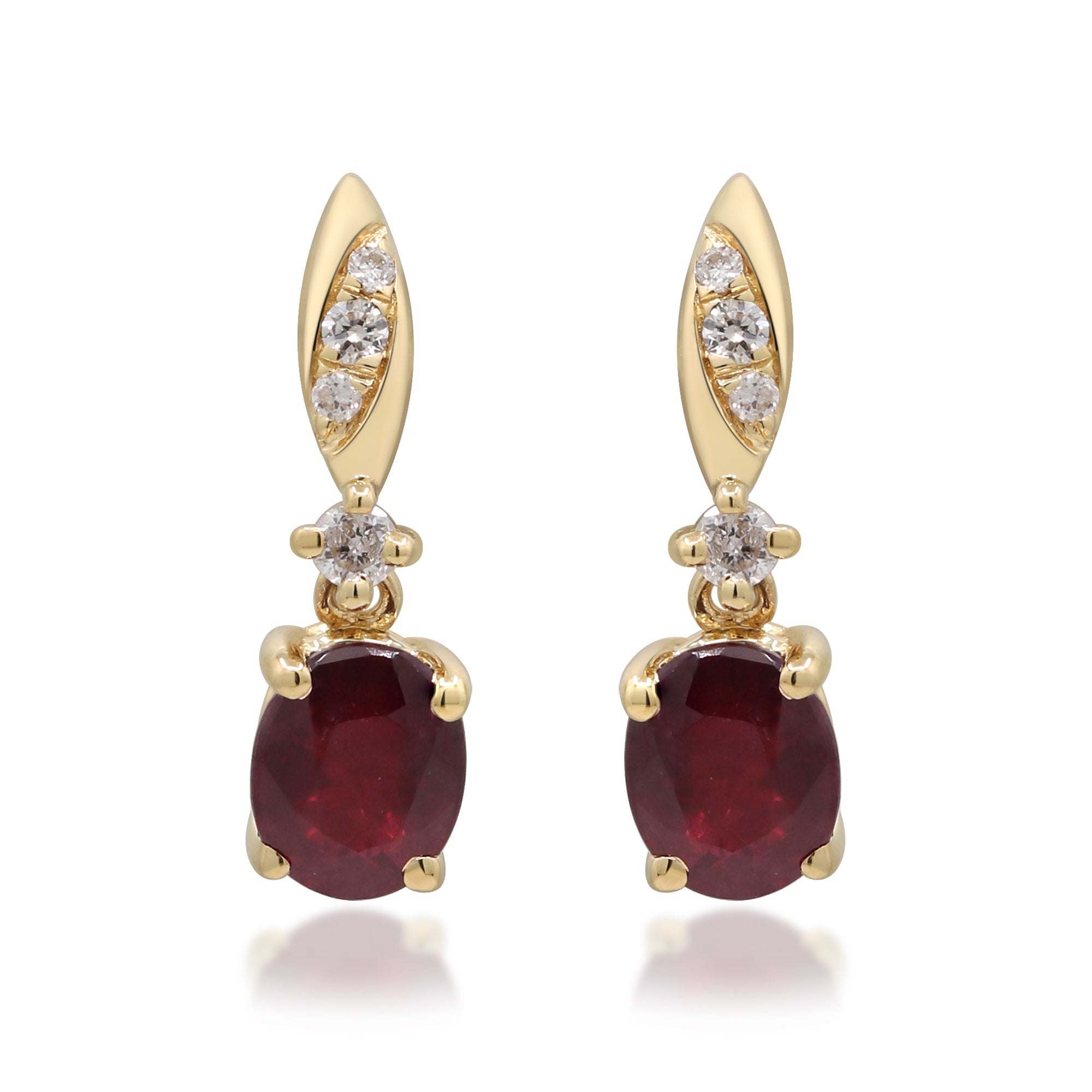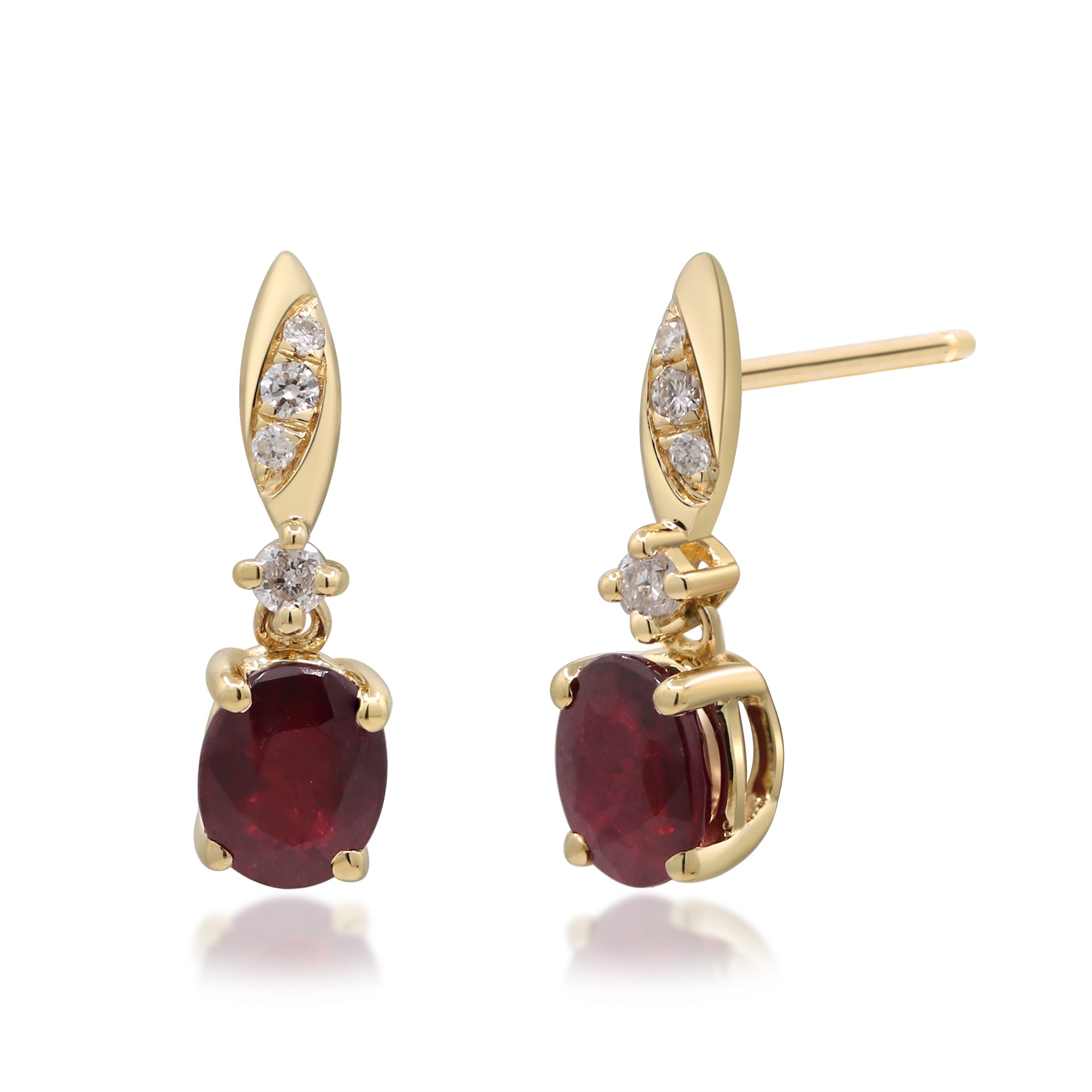 Decorate yourself in elegance with this Earring is crafted from 14-karat Yellow Gold by Gin & Grace. This Earring is made up Oval-cut Mozambique Ruby (2 pcs) 0.82 carat and Round-cut White Diamond (8 Pcs) 0.07 Carat. This Earring is weight 1.16 grams. This delicate Earring is polished to a high finish shine.