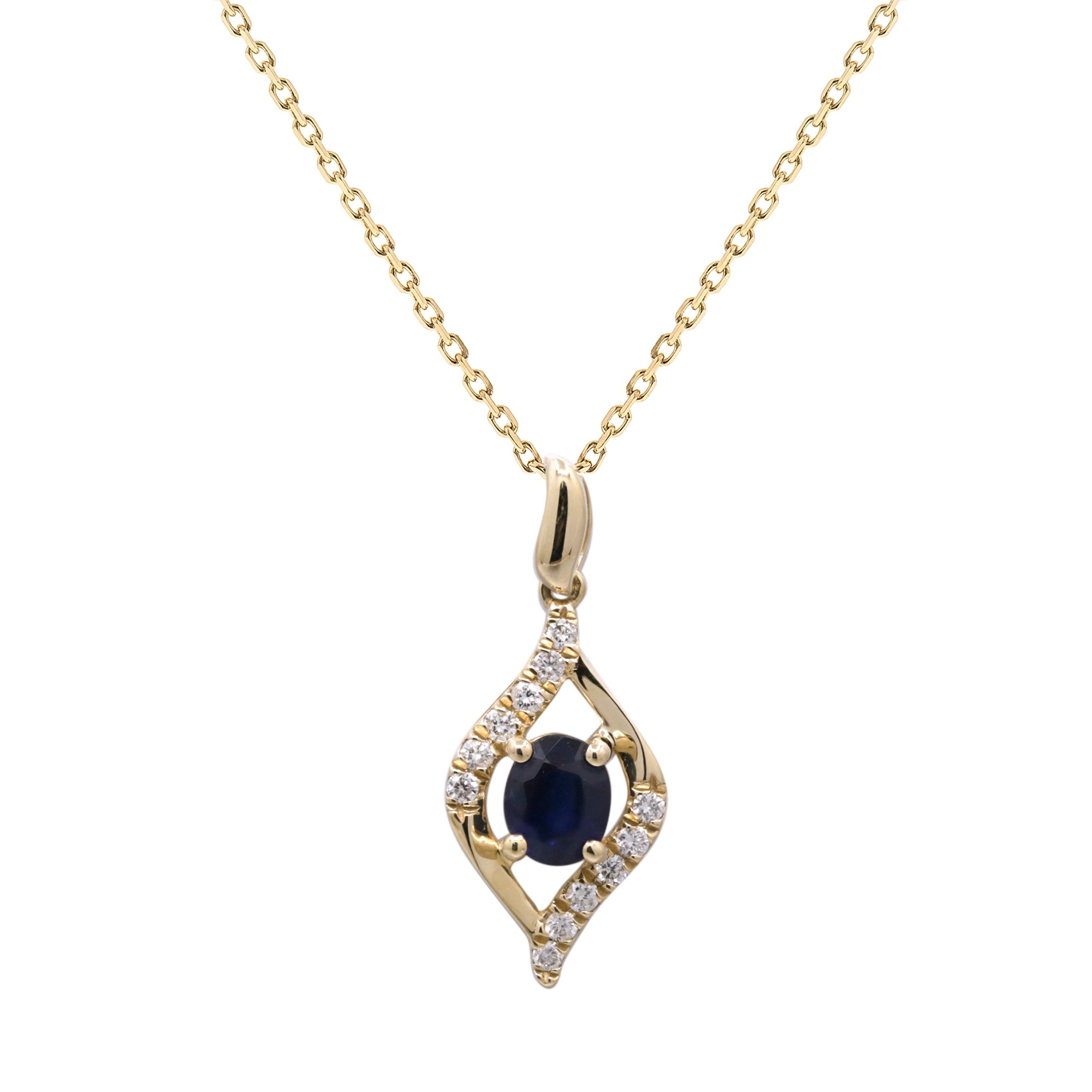 Decorate yourself in elegance with this Pendant crafted from 14K Yellow Gold by Gin & Grace. This Pendant is made up of Ceylon Blue Sapphire Oval-cut (1 pcs) 0.45 and Round-cut White Diamond (12 Pcs) 0.10 Carat. This Pendant weigh 1.71 grams. This delicate Pendant is polished to a high finish shine.