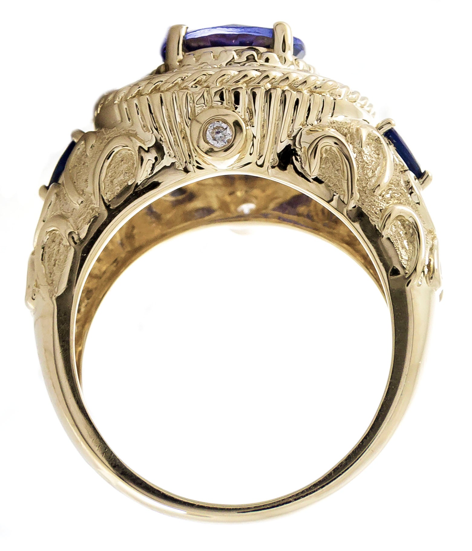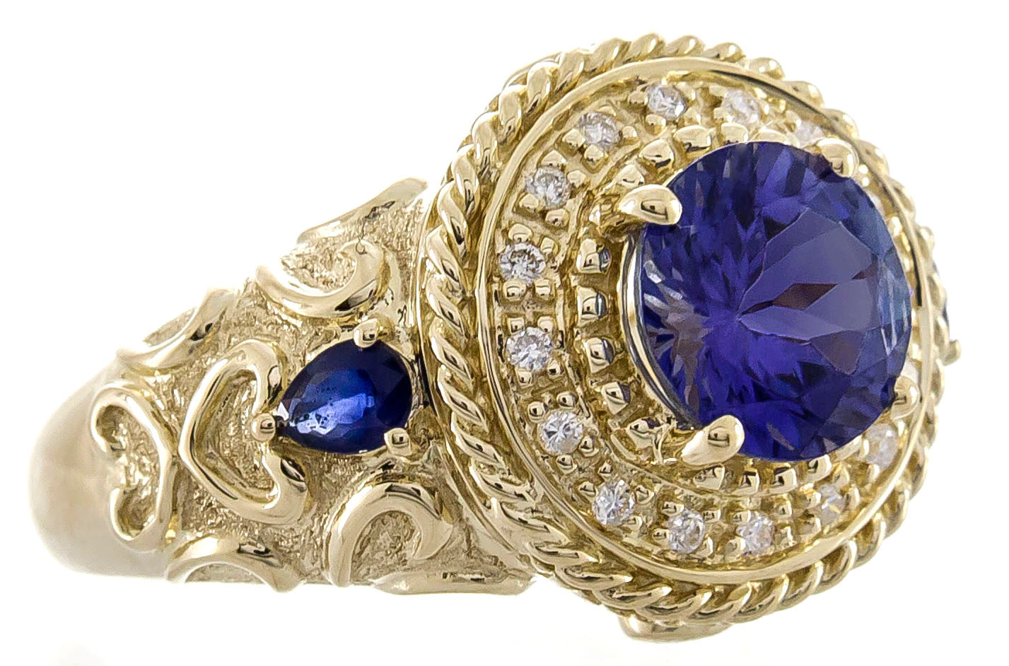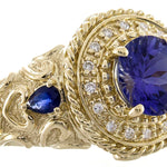 Decorate yourself in elegance with this Ring is crafted from 14-karat Yellow Gold by Gin & Grace. This Ring is made up of 8.0 mm Round-cut (1 pcs) 2.25 carat, 3x4 mm Pear-cut (2 pcs) 0.28 carat Tanzanian Tanzanite and Round-cut White Diamond (18 Pcs) 0.14 Carat. This Ring is weight 6.32 grams. This delicate Ring is polished to a high finish shine.