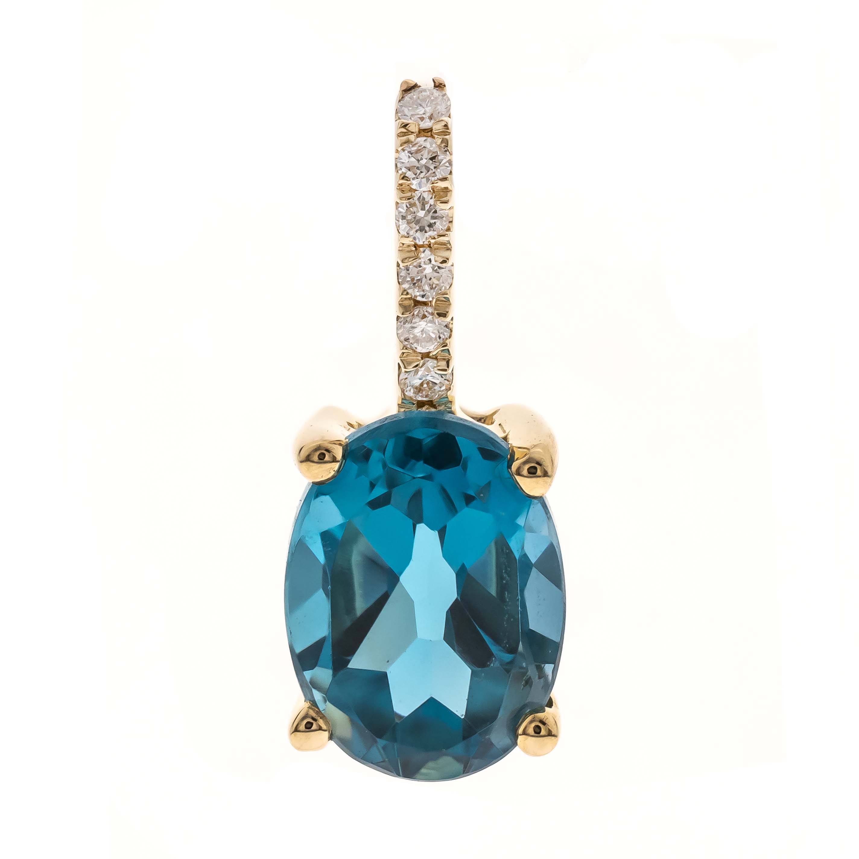 Decorate yourself in elegance with this Pendant is crafted from 14-karat Yellow Gold by Gin & Grace Pendant. This Pendant is made up of 8x6 mm Oval-Cut Prong setting Brazilian London Blue Topaz (1 Pcs) 1.62 Carat and Round-Cut Prong setting White Diamond (6 Pcs) 0.04 Carat. This Pendant is weight 0.63 grams. The gorgeous Pendant hangs from an 18-inch wheat chain. This delicate Pendant is polished to a high finish shine.