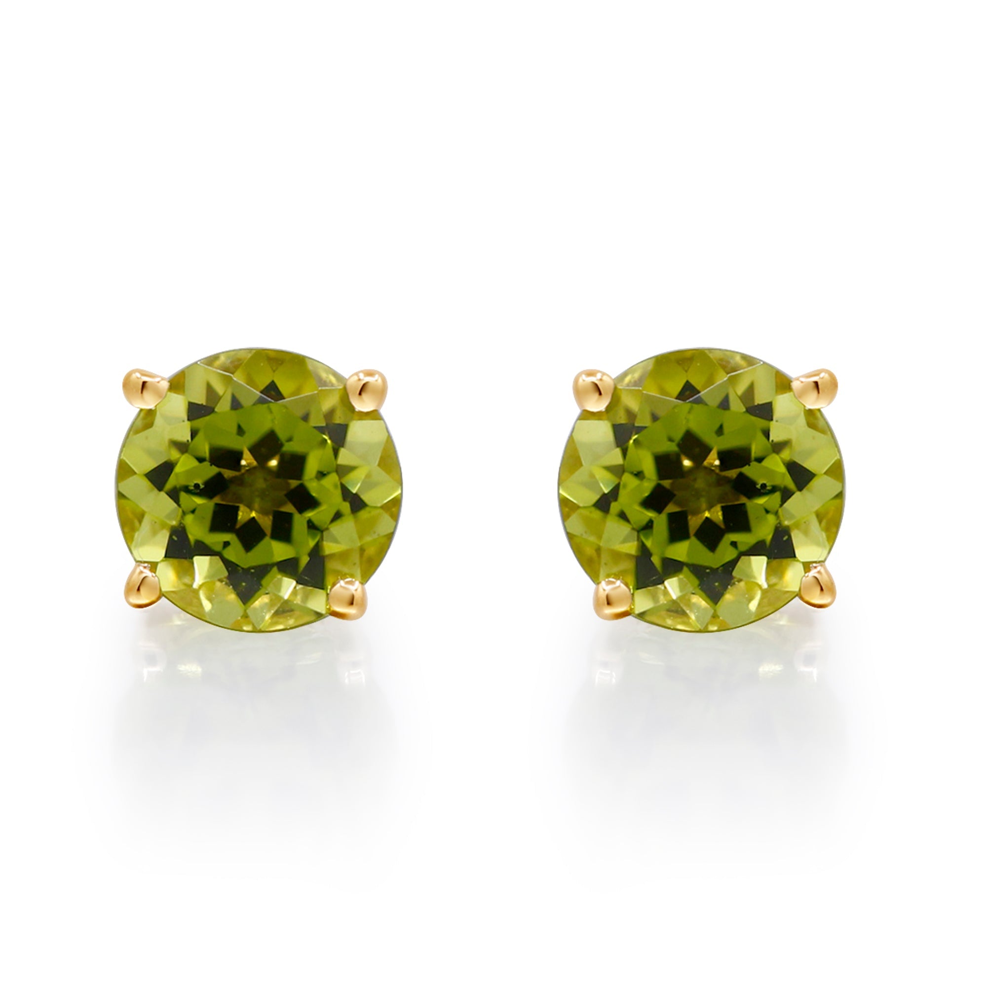Add a bold dash of color to your look with these striking stud earrings. Each stud has a round-cut Manchurian Peridot, the vibrant green gemstone prong-set into an open basket that allows light to pass through and illuminate the color. The gorgeous studs secure with comfortable butterfly clasps. Details: Prong Setting Stud Earrings Butterfly clasps 14k Yellow Gold High polish finish Metal weighs 1.2 grams Peridot measures 7 mm Peridot weighs 2 2/5 carats Two round-cut, green peridot gemstones Earrings measure 8 mm wide x 8 mm long x 4 mm deep.