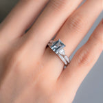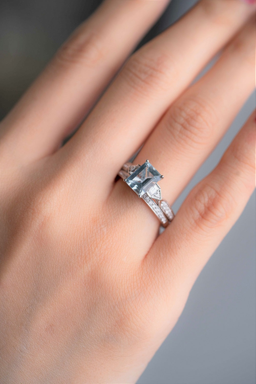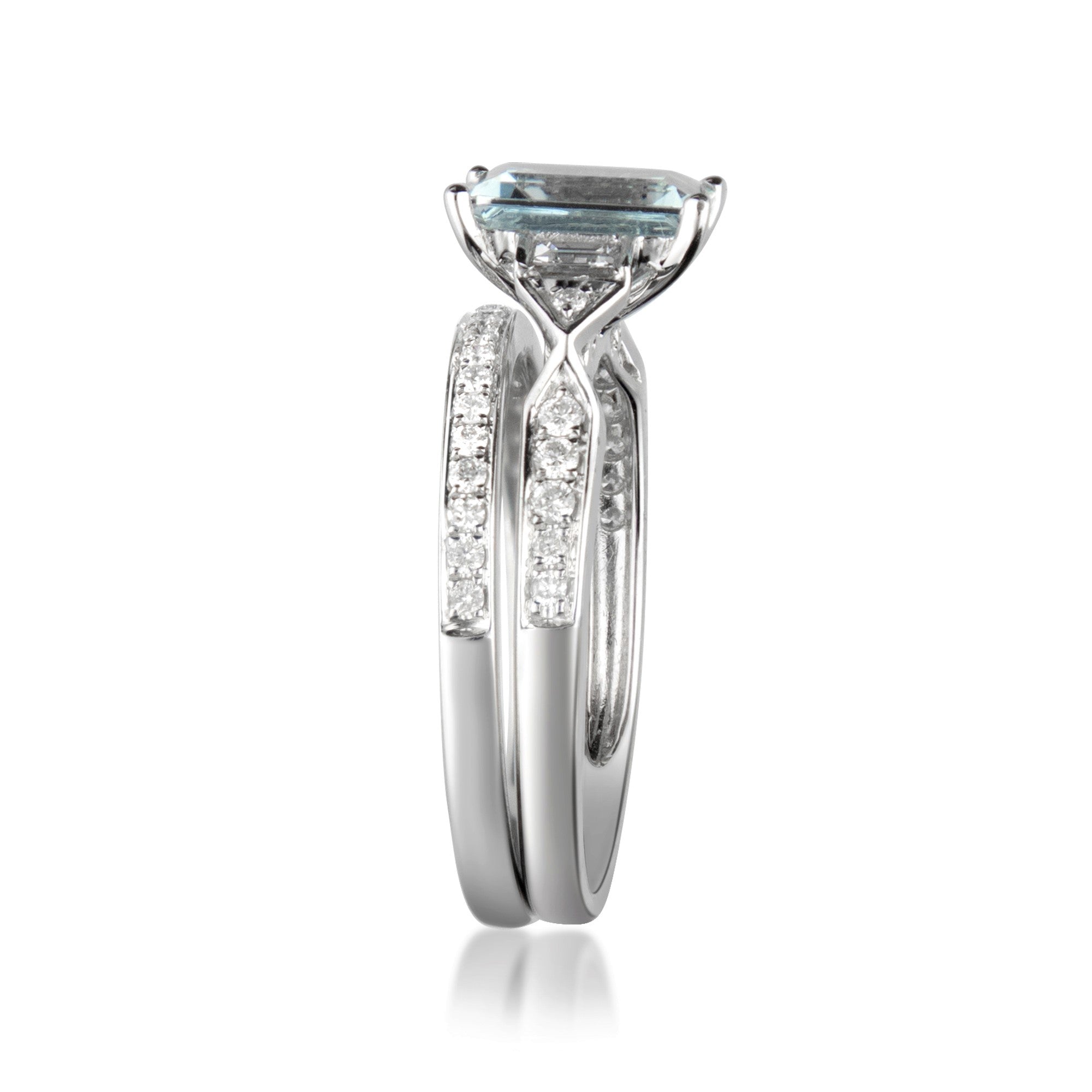 Stunning, timeless and classy eternity Engagement ring. Decorate yourself in luxury with this Gin & Grace ring. This ring is made up of 6X8 Emerald-Cut Prong Setting Genuine Brazilian Aquamarine (3 pcs) 1.32 Carat and Round-Cut Prong Setting Diamond (34 pcs) 0.26 Carat accent stones for a lovely design. This ring is weight 3.30 grams. The ring is crafted of shining 14-karat White Gold and is completed by a highly polished finish.